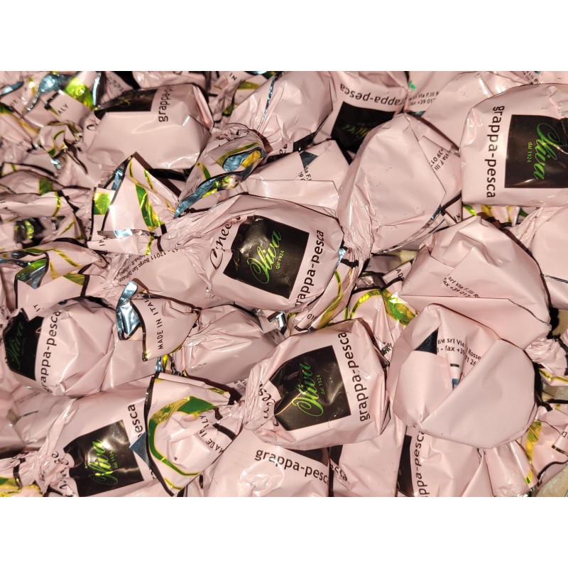 Enrobage chocolat noir, intérieur ganache noire avec eau de vie de pêche