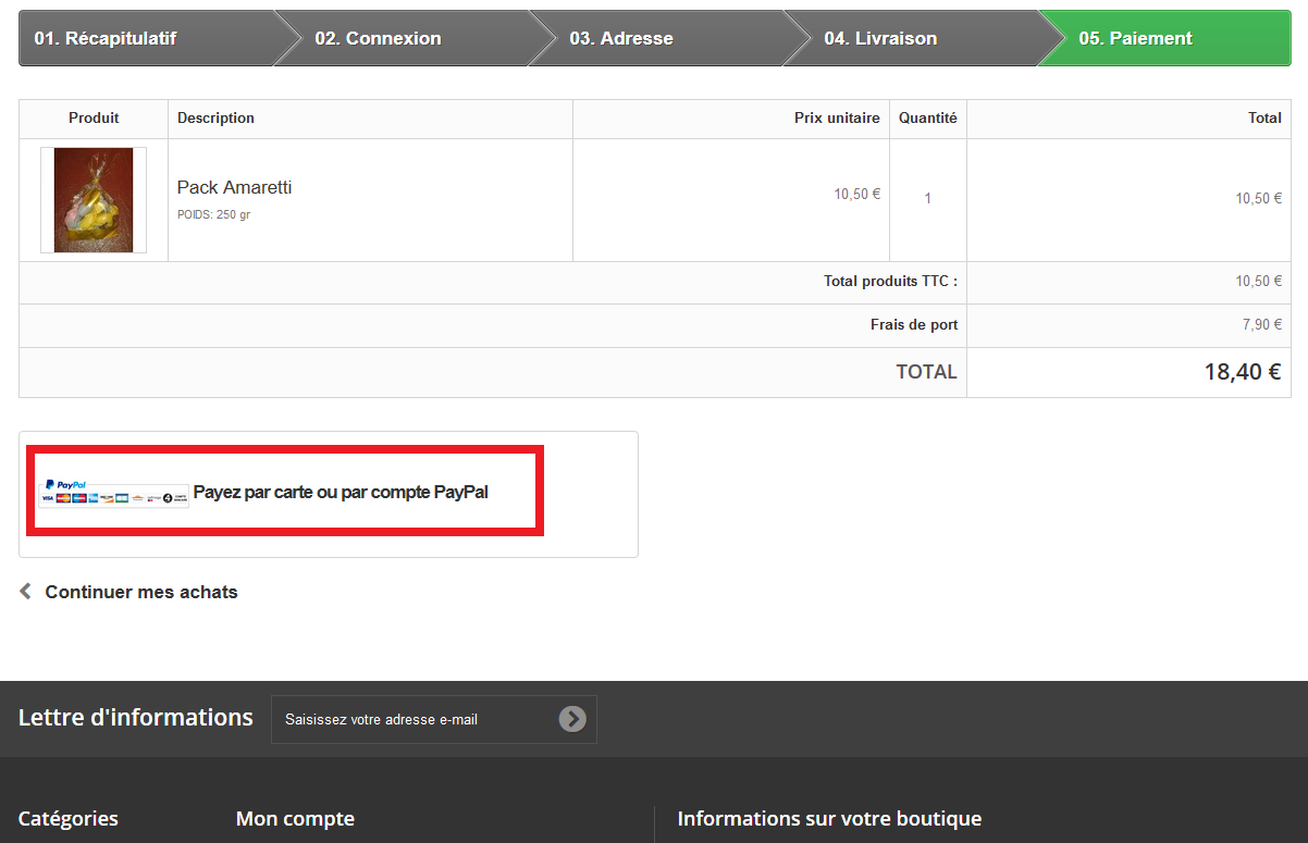 Pour cela, lors de votre commande, dans la partie "05. PAIEMENT", cliquez sur PAYER PAR CARTE BLEUE OU PAR COMPTE PAYPAL